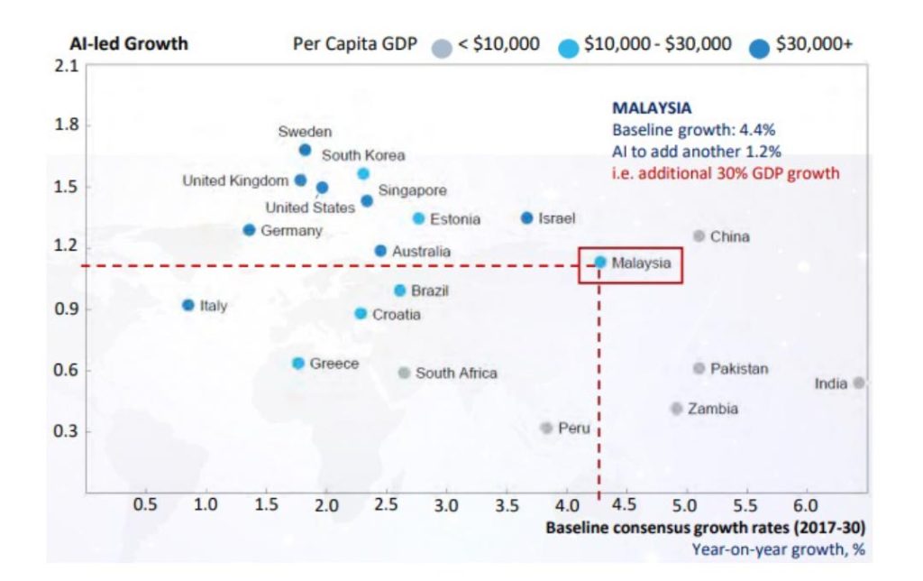 Using McKinsey data, simulation in 2018 reported that Malaysia’s baseline growth is about 4.4%, and with AI-led growth, there is an additional 1.2% growth impact, that leads to an increment of 30% GDP growth.